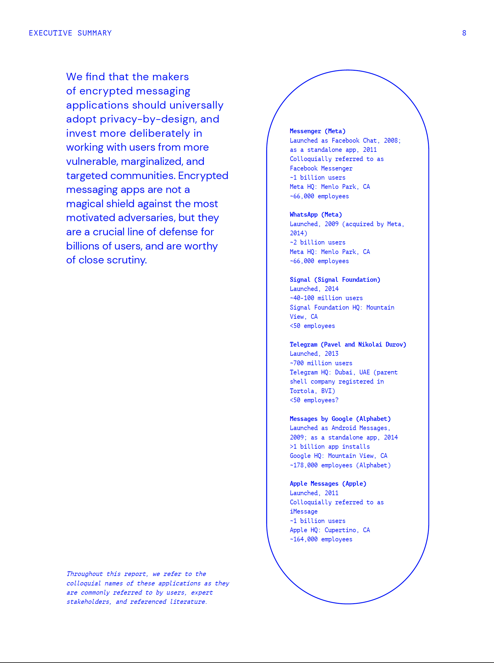 From September 2022 through May 2023, we analyzed popular messaging apps–including Signal, WhatsApp, Telegram, Messages by Google, Apple Messages and Meta’s Messenger–across a range of dimensions, including technical security, user experience, how the apps engage with users and developers, and their policies, terms and conditions. We sought to understand how people form mental models of their own individual or group digital security and corresponding threats, ways in which the technical and design decisions that the developers of encrypted messaging apps make can leave users vulnerable, and potential solutions that encompass technical, design, and policy adjustments.